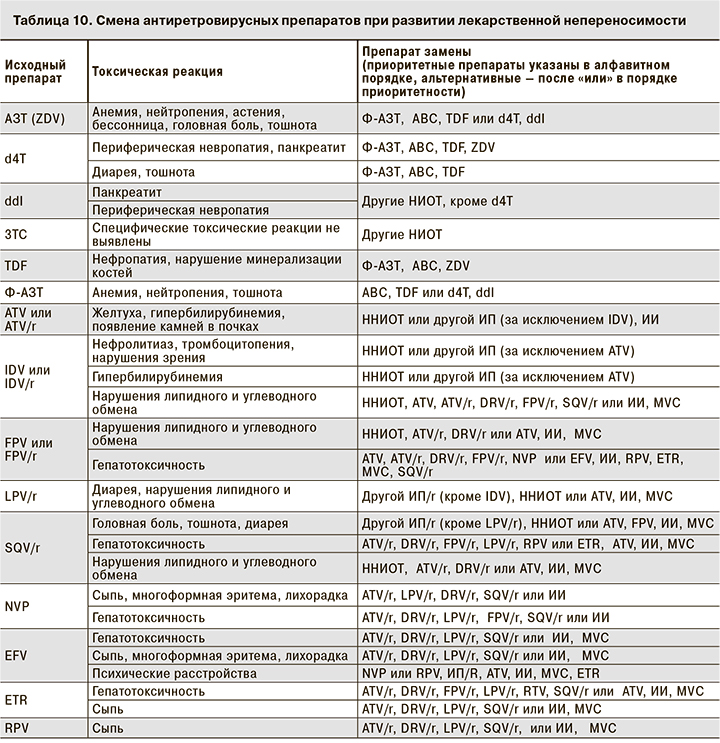 Необходимо учитывать и возможное взаимодействие с другими (не только антиретровирусными) препаратами, входящими в схему лечения. При этом нельзя забывать и о препаратах, которые больной в настоящее время не получает, но которые, возможно, будут ему вскоре назначены. В табл. 10 представлены варианты замены антиретровирусных препаратов при развитии нежелательных явлений.